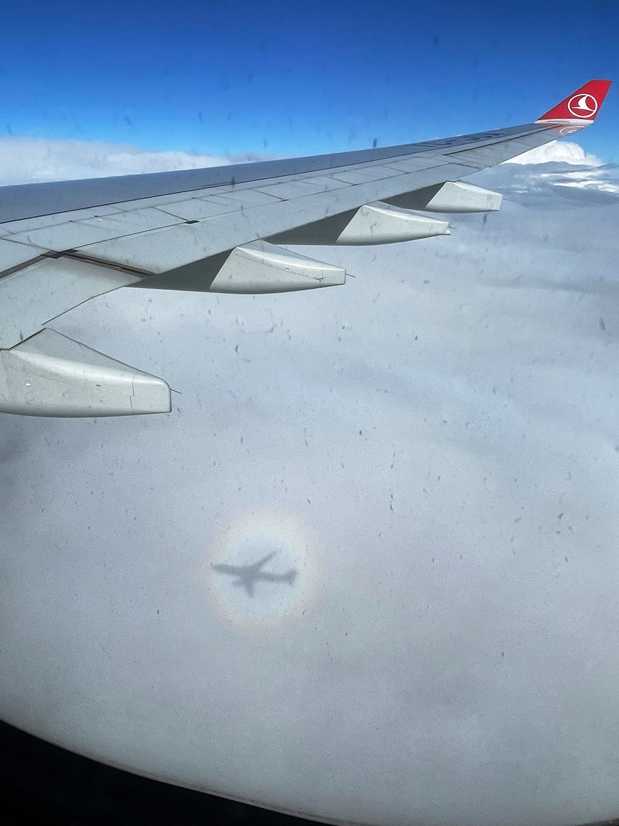 飛行機の窓から、虹の輪の中に飛行機の影。 なんて不思議な光景。 調べたら「ブロッケン現象」という名前がついていた。 なんか良いことがありそう?? イスタンブール空港到着です?(?????)? https://t.co/IXtPkIluBB