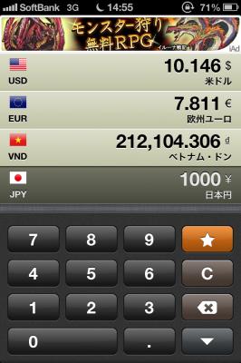 必要な通貨を登録しておくと、瞬時に同時に通貨換算される。今は円とドルとドンとユーロを登録してある状態で、例えば日本円に¥1000と入れると、ドンでは212104ドン、ドルでは10.146ドル、ユーロでは7.8ユーロ、という具合に表示される。円じゃなく外貨金額指定でもOK。