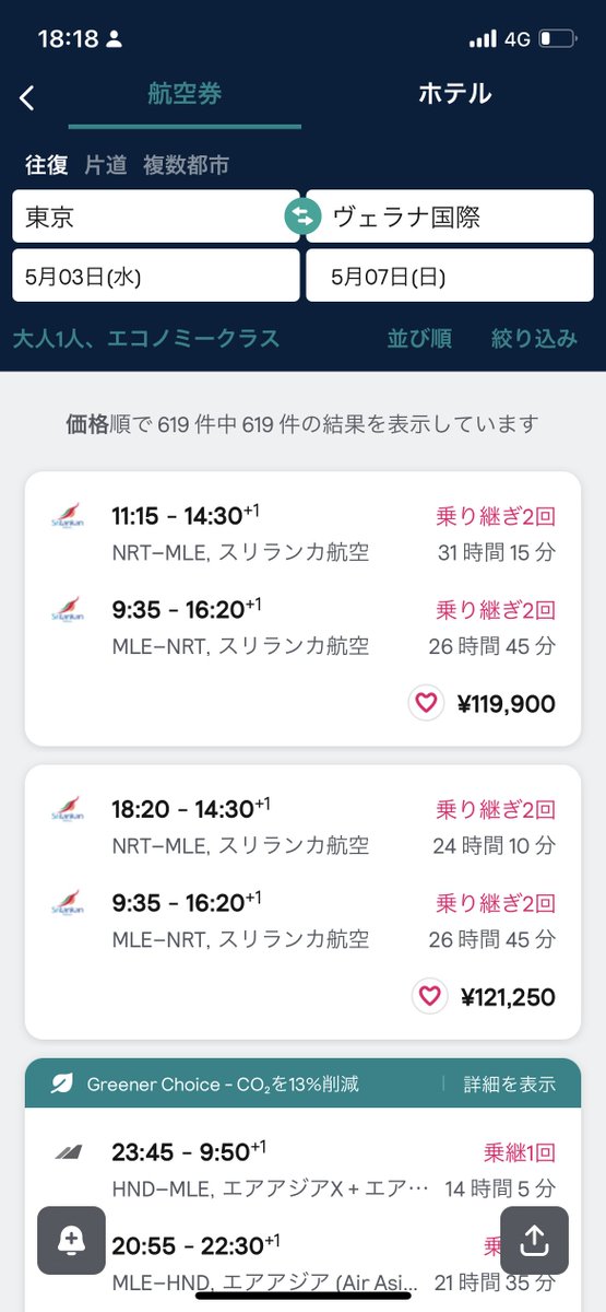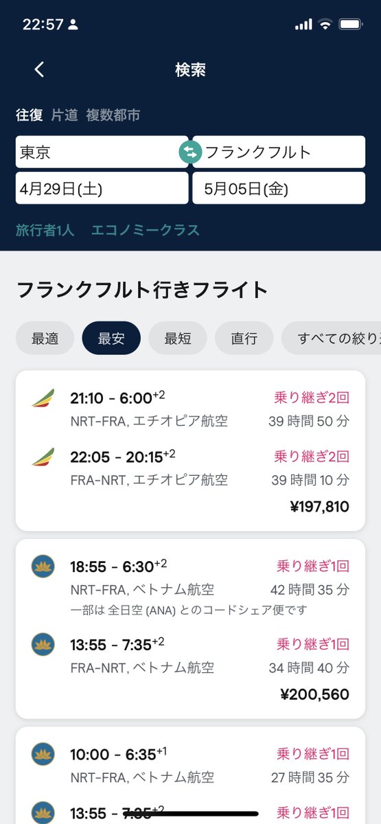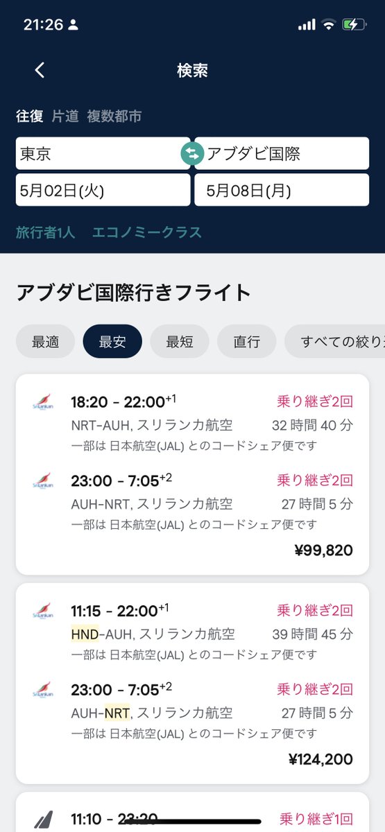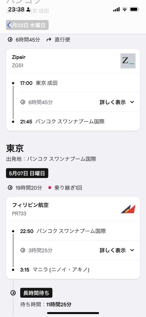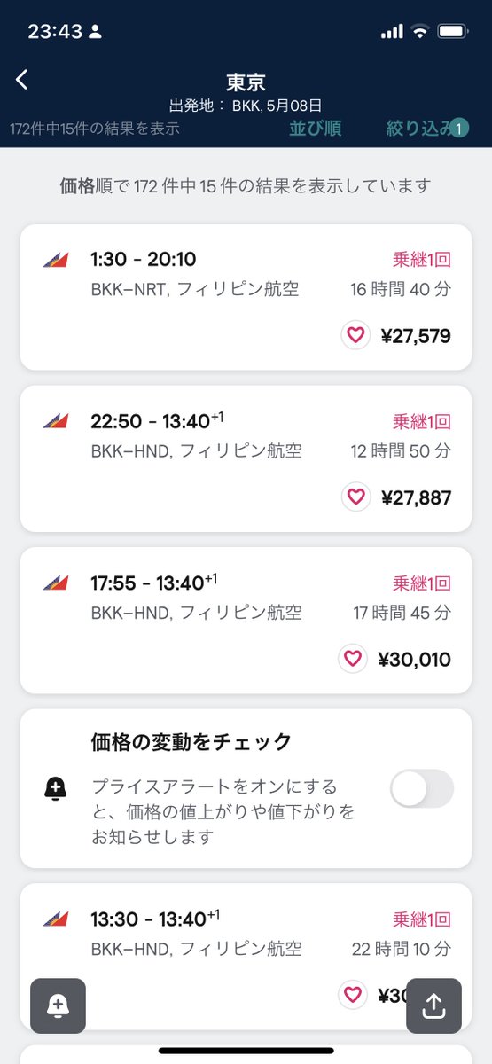 予算やコスパを考えるとやっぱアジア圏だよねぇ。 と調べたバンコク行き。とりあえずバンコクに出ればその後はどこにでも安く飛べる。 4/29-5/6はさすがにLCCでさえ10万近くするけど日程をずらしたら手ごろなチケット出てきました♪… twitter.com/i/web/status/1…