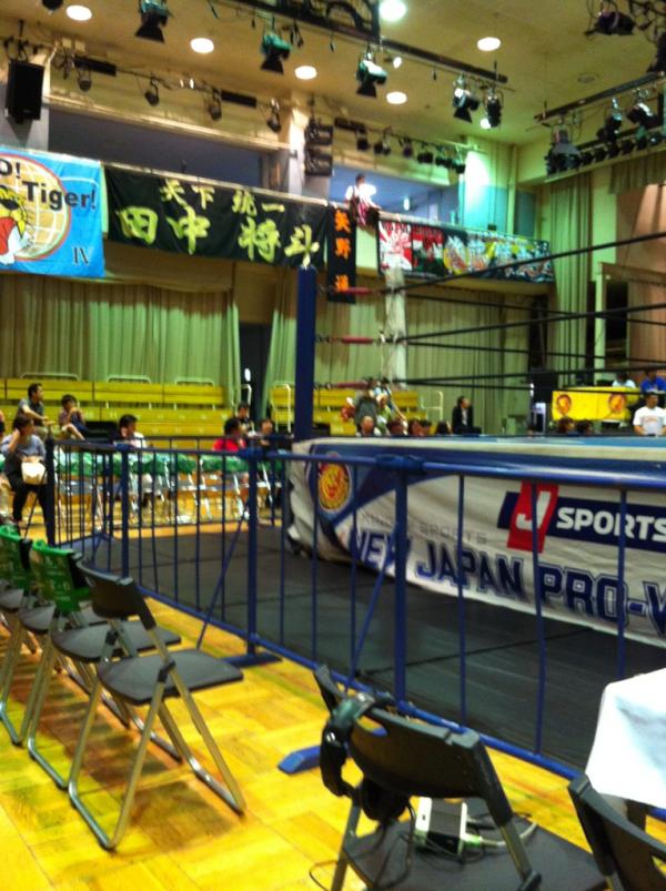初プロレス観戦、リングサイド席。これはもしやパイプ椅子が飛んでくる席なのでは。ドキドキ。ご招待に多謝! http://t.co/7jFVQMRF