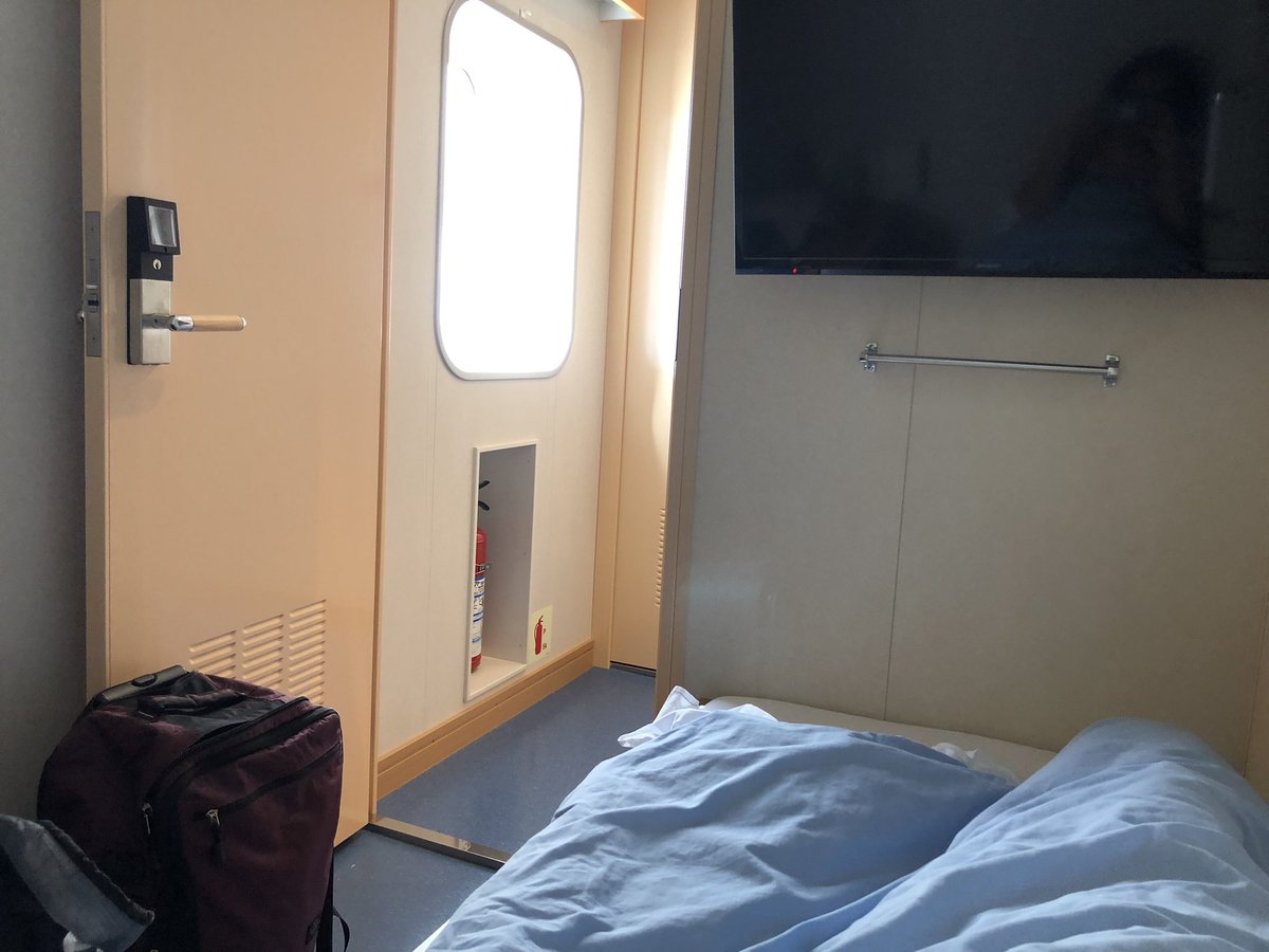 端っこの部屋なんでドア開けっぱなしにすれば採光取り入れられると気づく。閉めると真っ暗。 船酔いは今のところ大丈夫だけど寝ててもずーと微弱な振動の上にいる感じで少しダメージなくもない #東京九州フェリー https://t.co/8ssee9vxhH