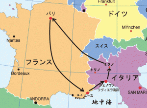 パリ→ニース→(南フランス満喫)→国境越え、イタリア入国→海岸伝いにまっすぐ港町ジェノヴァを目指す(リヴィエラ海岸満喫)→ミラノへ→夜行列車で!パリへ戻る→帰国(香港経由)
