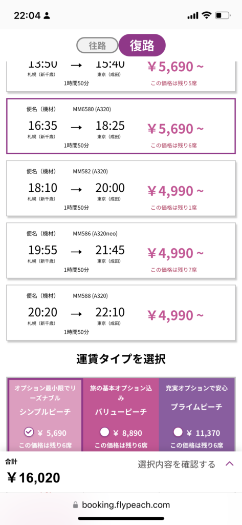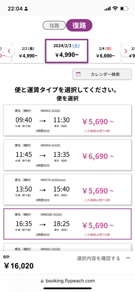 往路の羽田→千歳は普通に購入する。時間が良くて安いスカイマークの11:00羽田発711便を13640円で購入。最安値はこれより安い12000円の便もあったが朝早いか夕方になってしまうので選ばなかった。購入はスカイスキャナを経由してスカイマークの公式サイトにて。予約をした後、支払いの猶予が3日間ほどあるのはいいですね。その3日間の間に気が変わる可能性もあるので、冷静に検討できる。