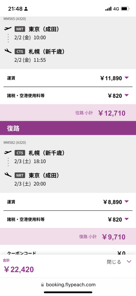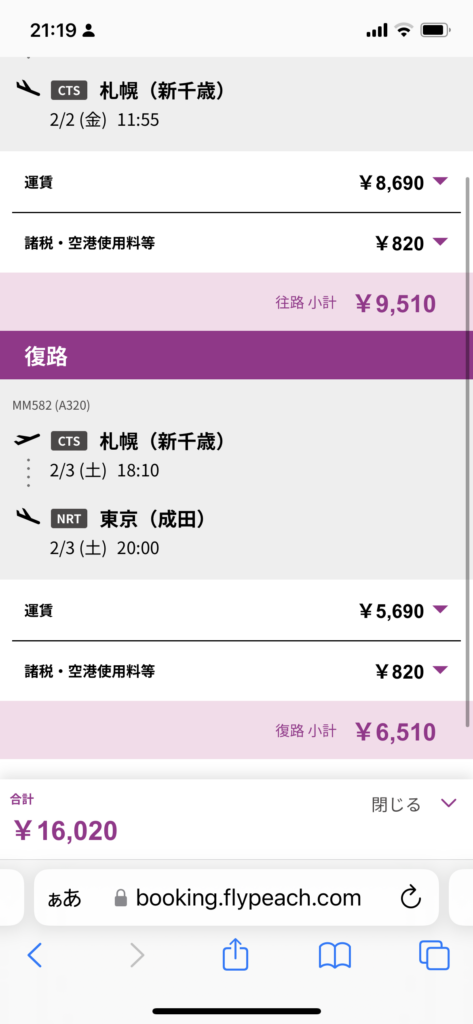 航空券はあれからずっと迷っていたらピーチ航空が12/21の20時からクリスマスセールを開始。それを待って価格を見てみると、なかなかお得になっていて、そこそこ悪くない時間でシンプルピーチで往復16000円くらい。行きは2/2の10時成田発~11:55千歳について、翌日の帰りは夕方の便で20時成田着。安いですね。でこれが、バリューピーチプラン(座席指定や荷物込み、キャンセル払い戻しあり)のだと22420円になる。ふむ。。