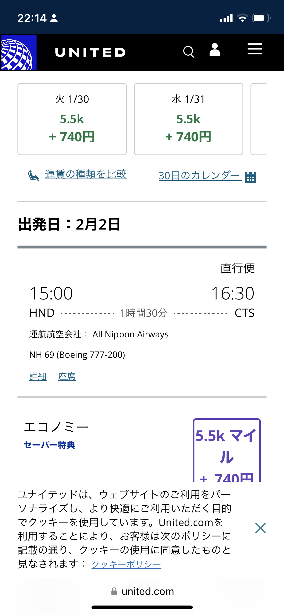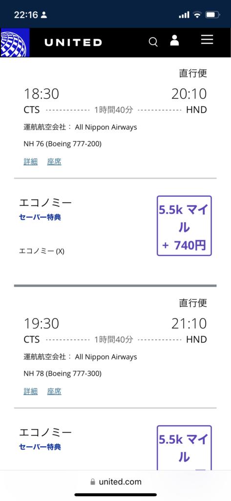 そして前回も検討にあがっていたユナイティッド航空のマイレージ活用だ。実はあの後しばらくしたら特典航空券のANA札幌直行便がなくなってしまい、経由便のみとなってしまい一度諦めた。