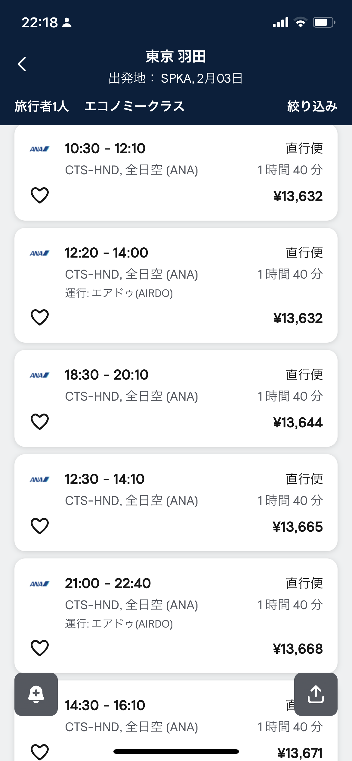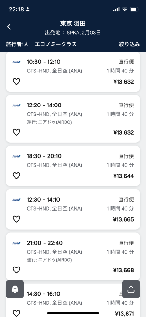 2024/2/3(土)ANA 千歳18:30 NH76便 ⇒羽田20:10 ※特典航空券(ユナイティッド)