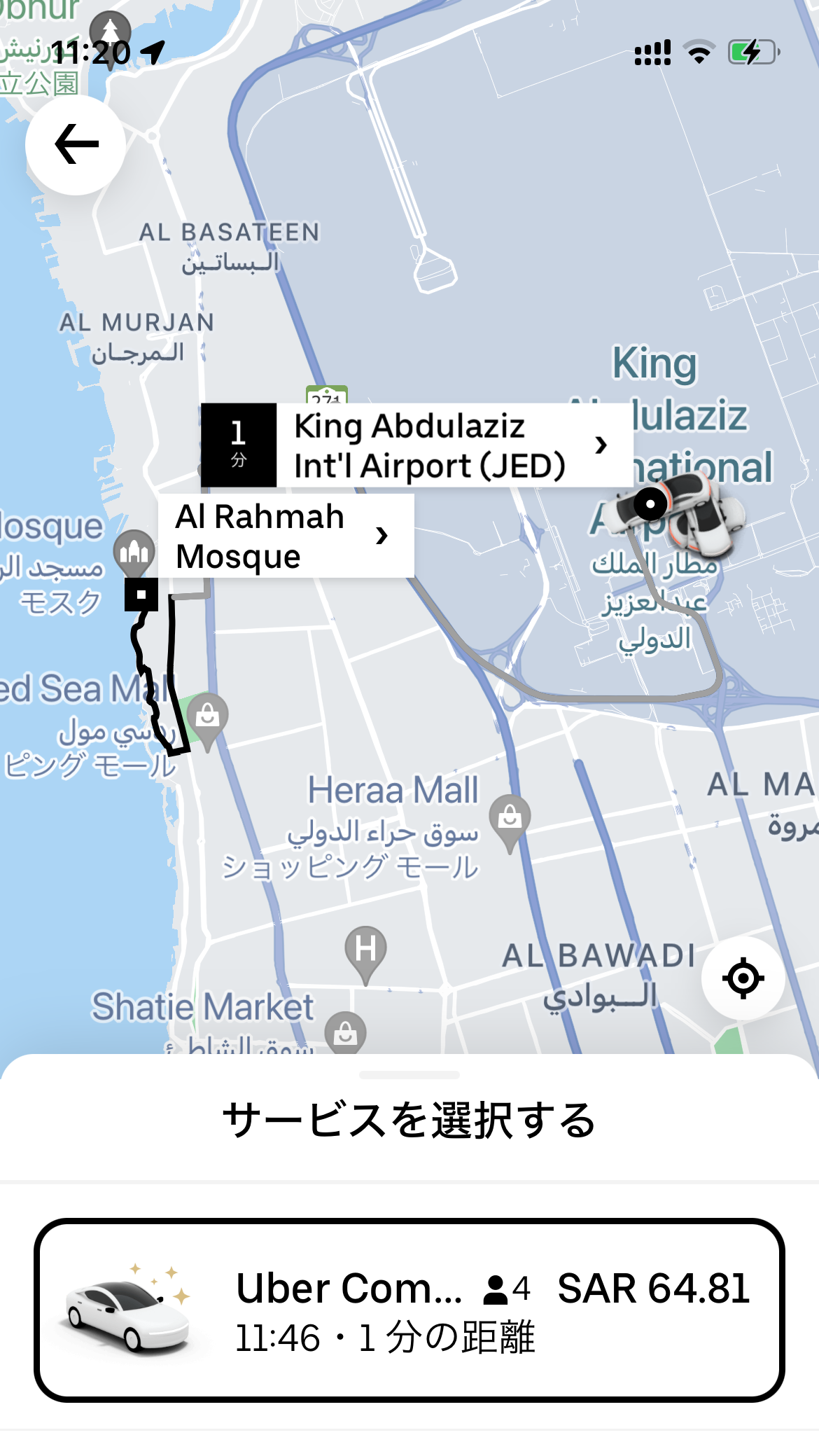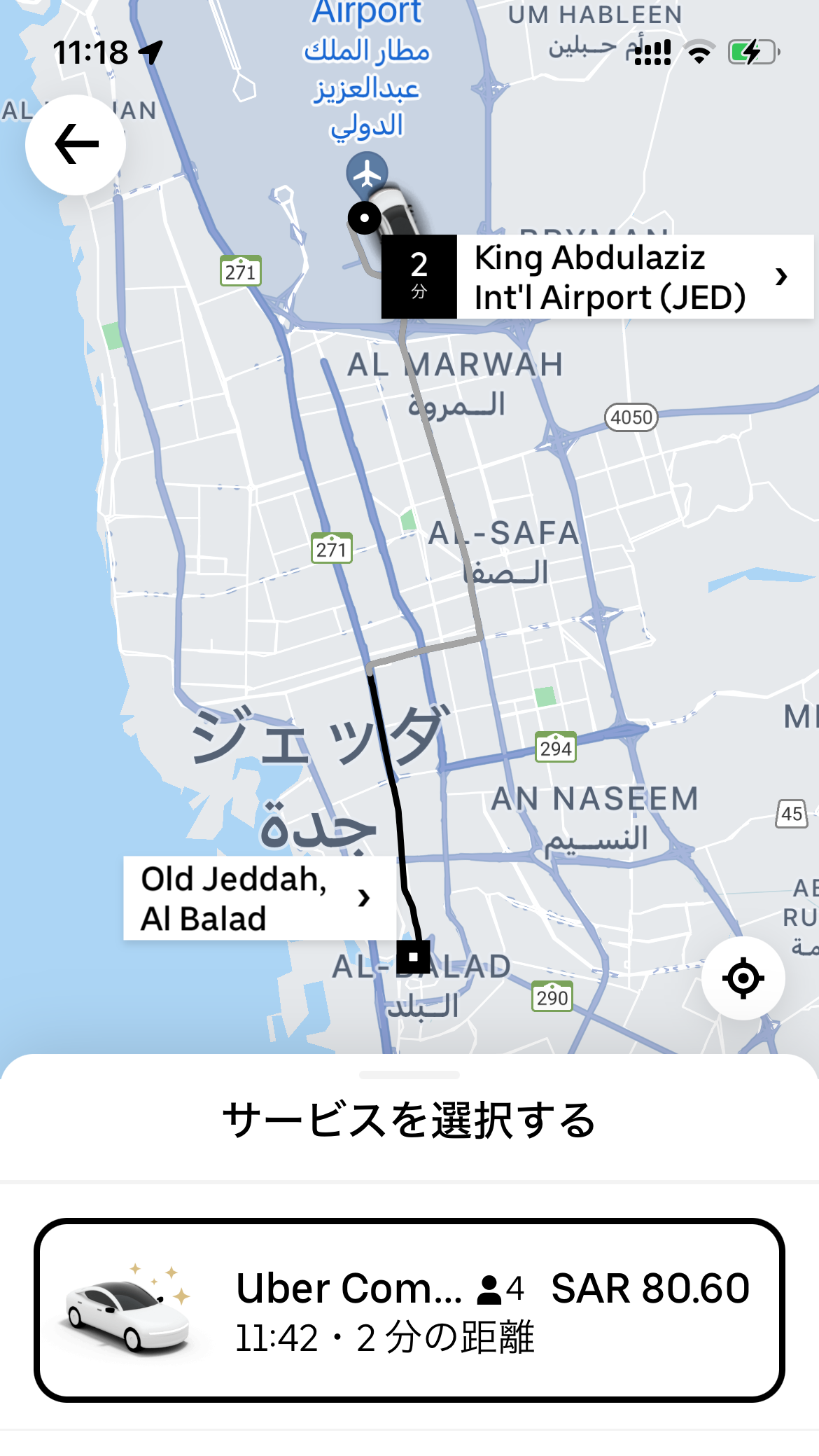 となると、タクシーが捕まりやすいかどうかが気になる。そこで実際にUberで調べてみることに。アジア圏ではGrabが主流なので使わないUberは削除してしまっていたのを入れ直す。そしてジッダ空港から市内をサーチ。