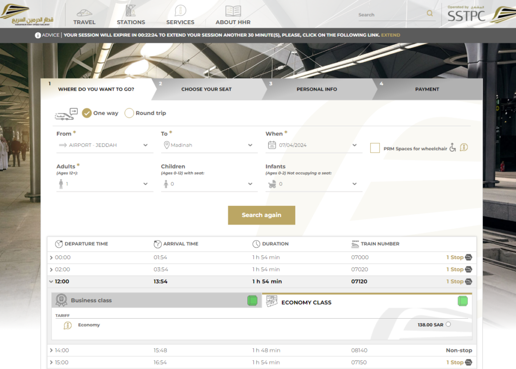 ちなみに料金はメディナまでエコノミークラス 138リヤル(約5500円)、ビジネスクラス 323リヤル(約13000円)だった。