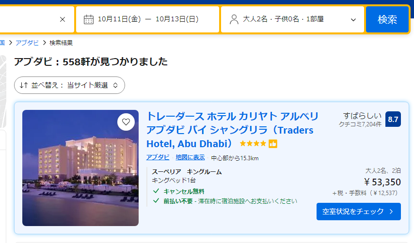 しかも、予約可能ホテルの一つ「トレーダースホテル」の相場を確認したら、2泊でなんと