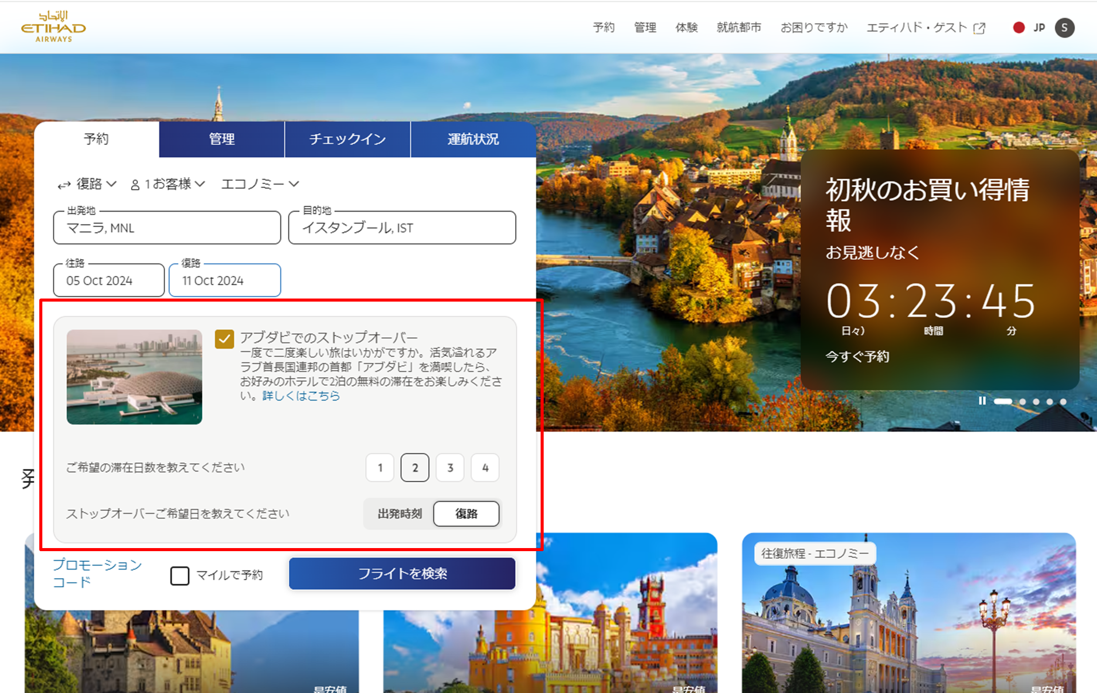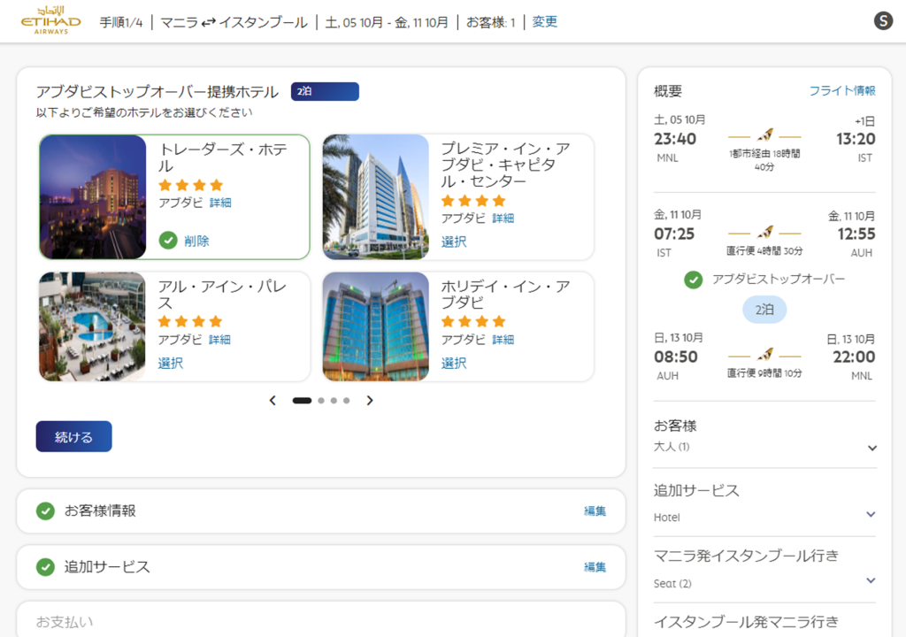 しかし便にこだわらなければプロモーションの「アブダビストップオーバー」のホテル1~2泊無料が付いてくる。だから、ずっと悩んでいた。このプロモは公式から買った場合にしか適応されない。