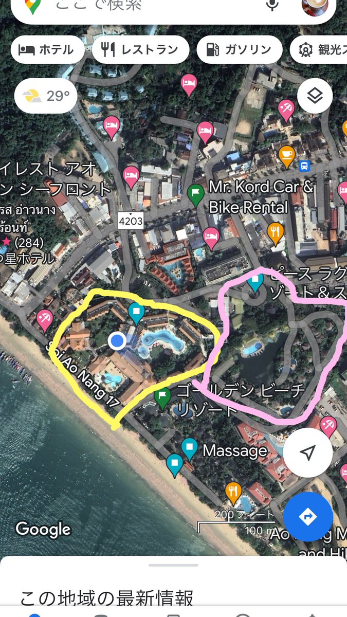そしてすぐ隣のピンクで囲んだとこが8年前に来たとき泊まった「ピースラグーナリゾート」?