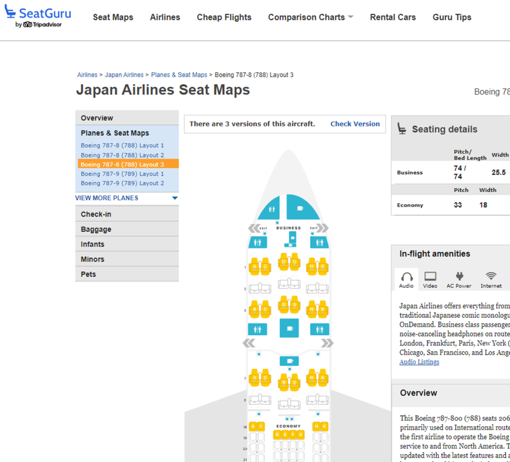 飛行機の良い席がわかるサイトSeatGuru先生にも聞いてみて、どこにしようか迷う~。A7にしようかと思ったけど、ビジネスのバルクヘッド席は逆に不便という考えもあり、K3にしょうかな。