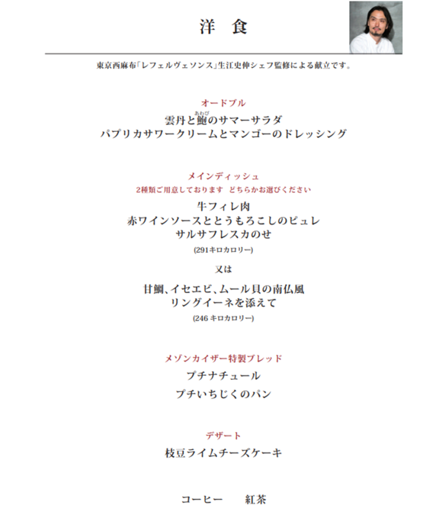 機内食も事前に予約できます。JALビジネスクラスの機内食は、数か月先まで決まっていて、和食と洋食がありメインディッシュが選べる。マニラの時は和食にしたけど(ほんとは洋食を事前に予約してたけど、深夜にステーキは厳しいなと当日和食に変えてもらった)今回は洋食にしてみよう。