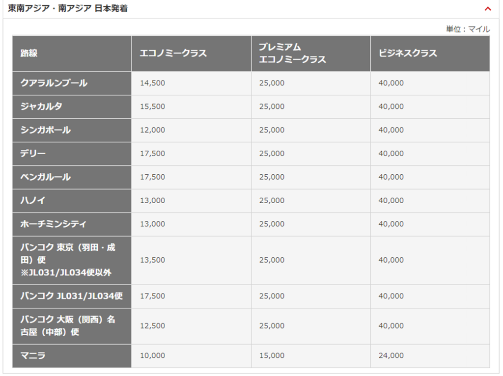 ▼通常時に必要なマイル