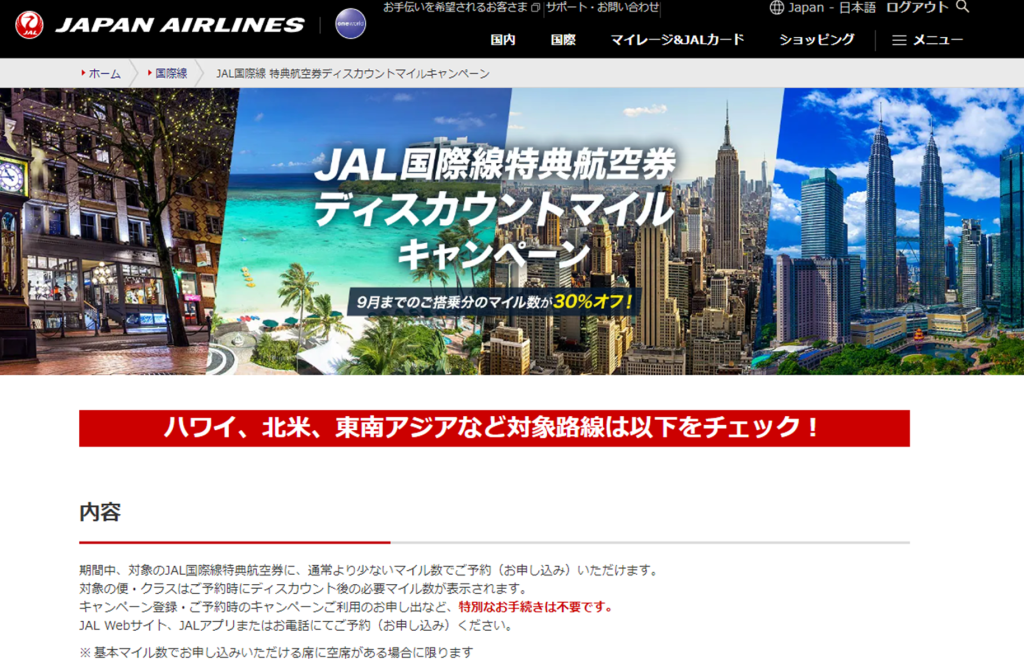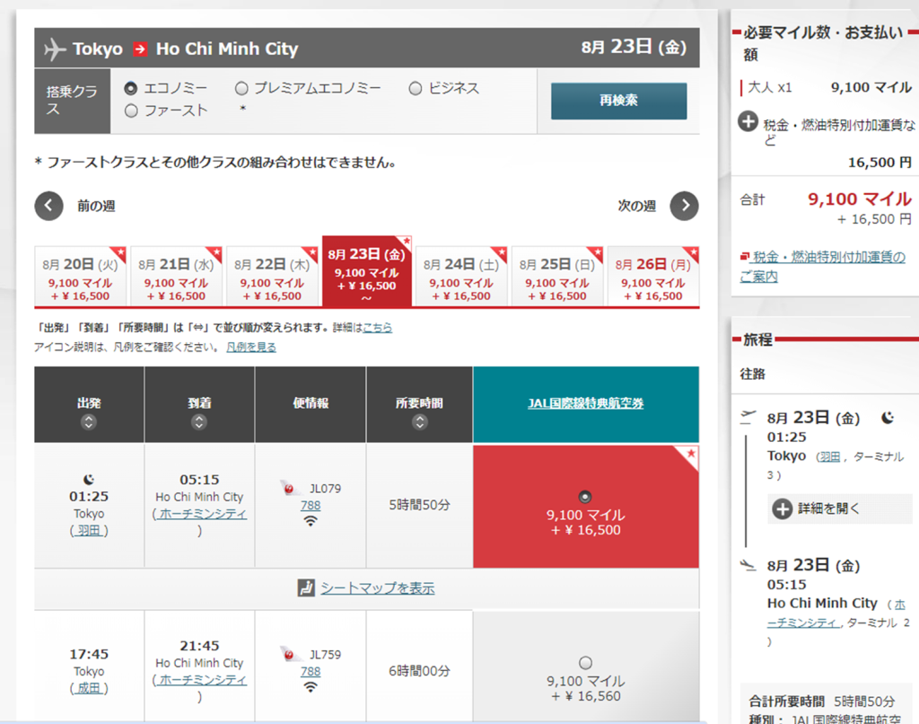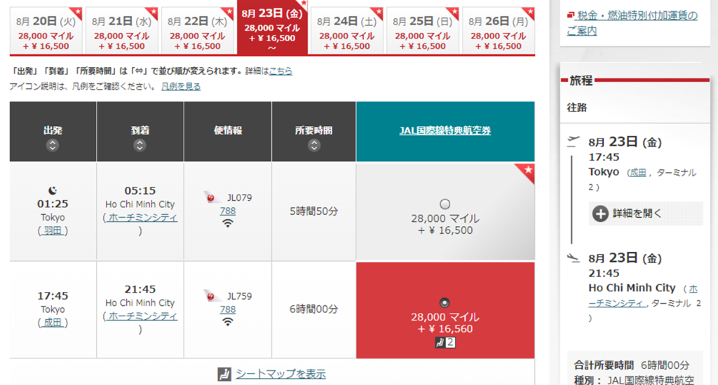 8月下旬の金曜日出発で28,000マイルと16,500円でした。本来40,000マイル必要なところ、ディスカウントマイルキャンペーン開催中で割安になっていました。ラッキー!