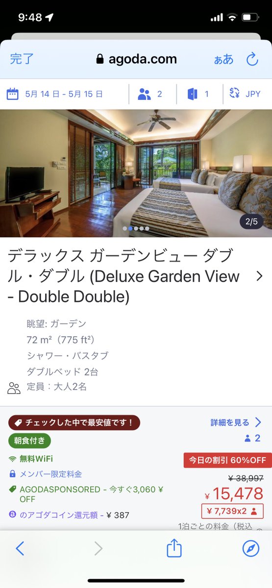 うまく予約すれば1人7000円台(2人1部屋15000円台)~可能だわ