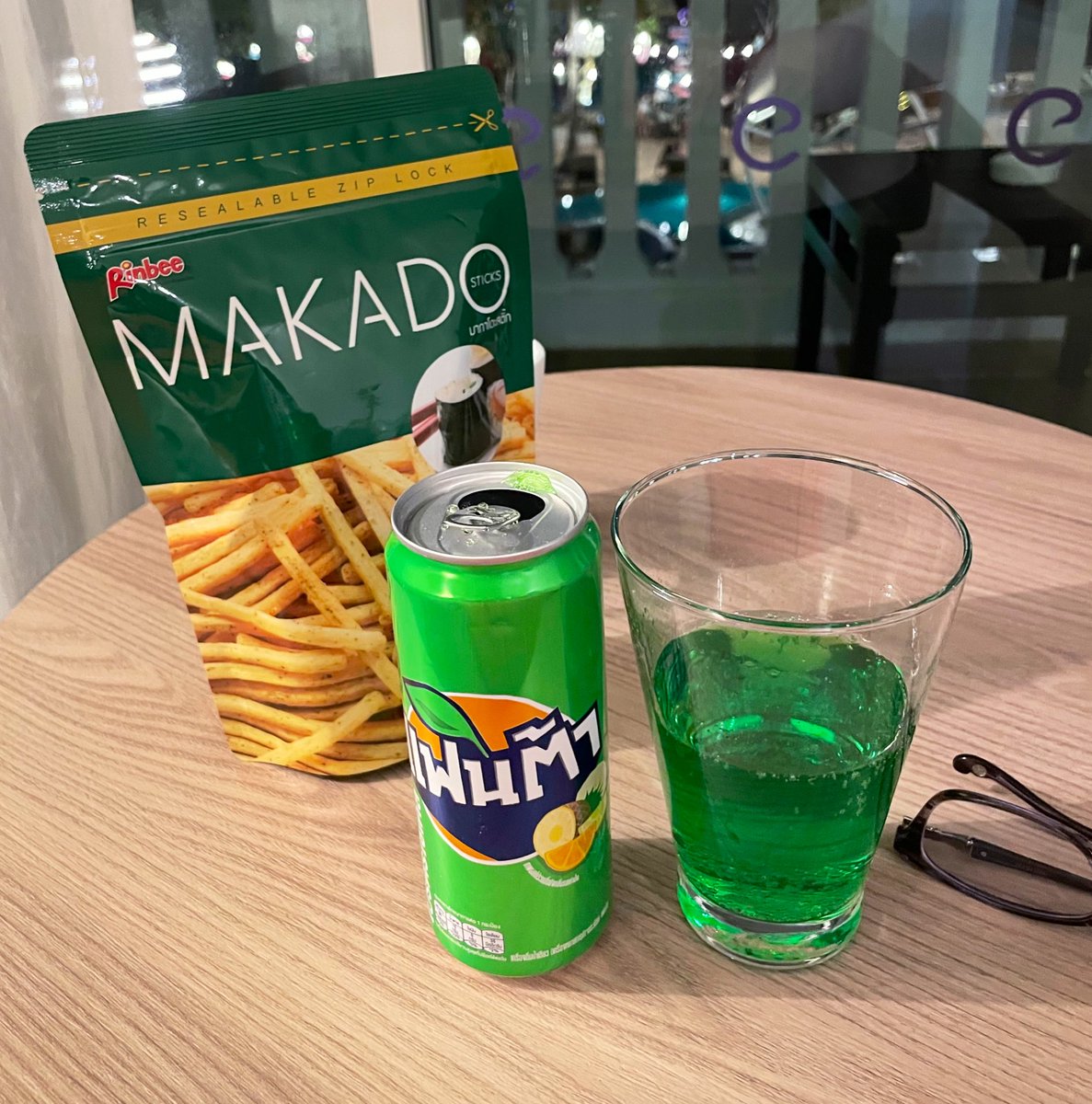 お風呂上がりにコンビニで買った鮮やかなメロンソーダのようなフルーツファンタと、海苔巻きの写真が違和感しかない海苔味ポテトスナックで一休み(´∀`*)