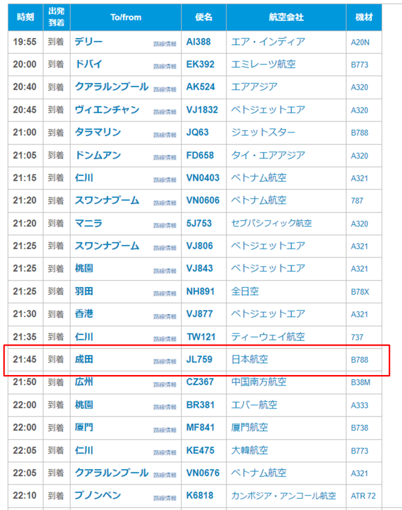そこで到着便が集中する時間を調べる。私が到着する8/23(金)の21:45前後を調べてみる。