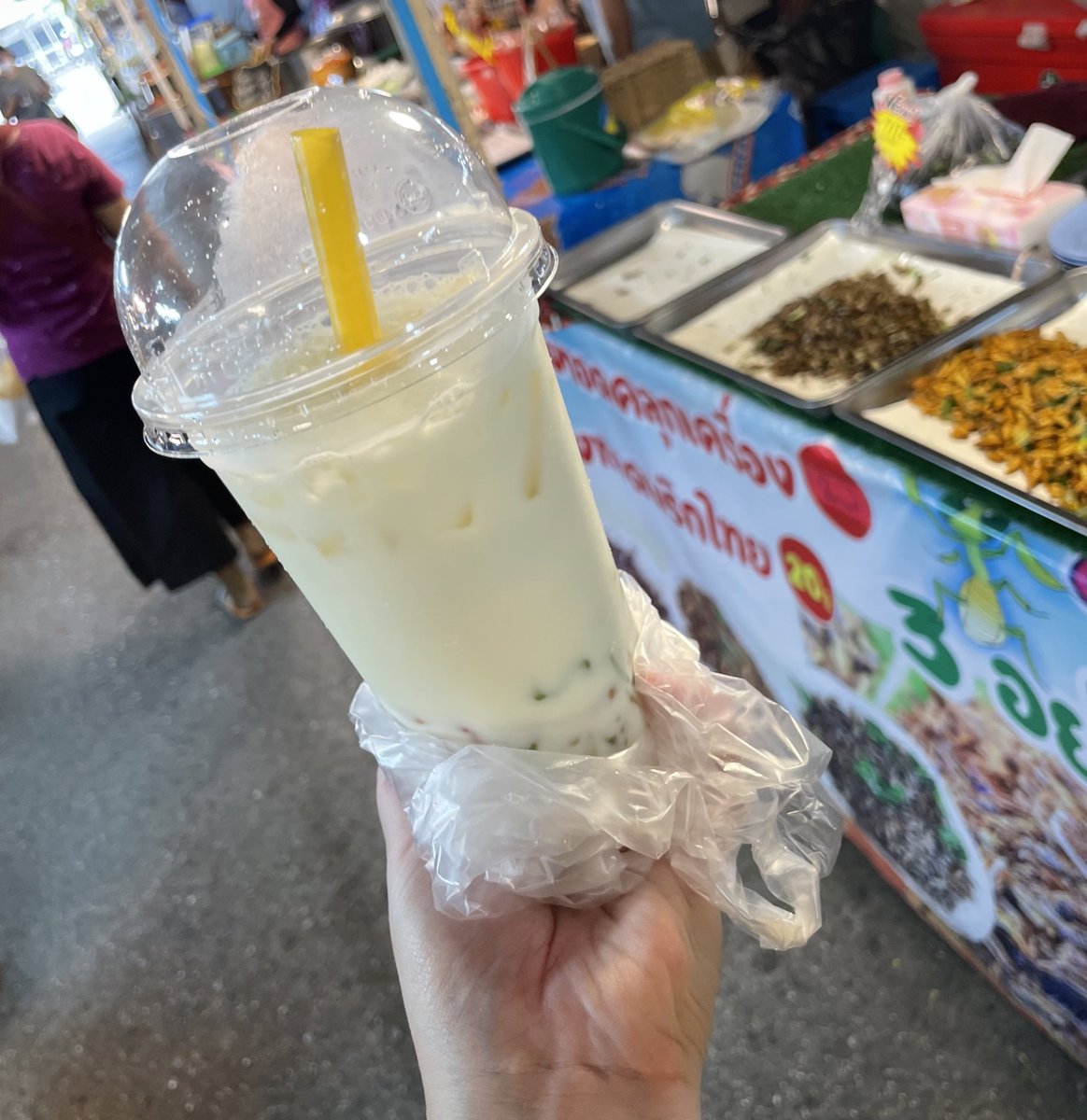 暑すぎて汗だっくだくなので水分補給にこのミルキーなドリンク購入。ゼリー的なものが入って25バーツ(100円)