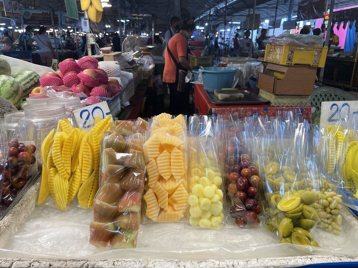 値段書いてなくて聞いても、ローカルマーケットだから英語通じないタイ語わからん。けどいいやって1000バーツ札出したら900返ってきた。