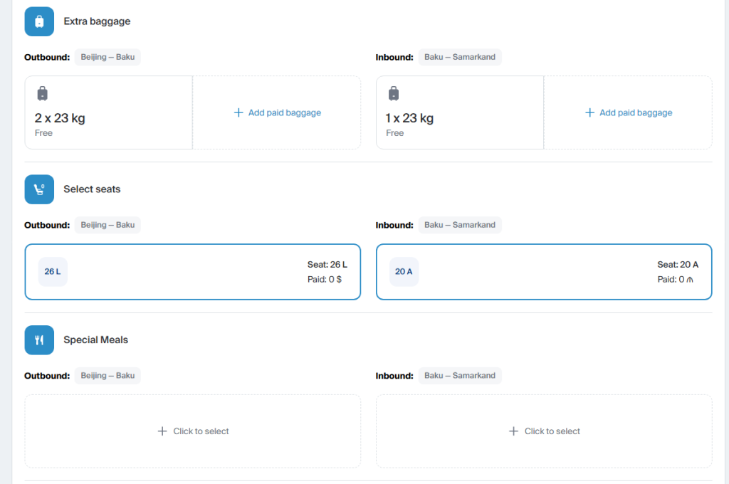 アゼルバイジャン航空の公式サイト(https://www.azal.az/)にアクセスすると、座席指定や追加荷物などの管理メニューがちゃんと用意されていた。代理店で買った場合も利用できるようだった。