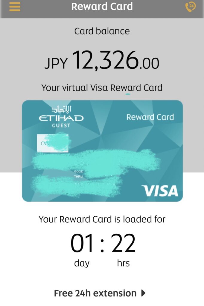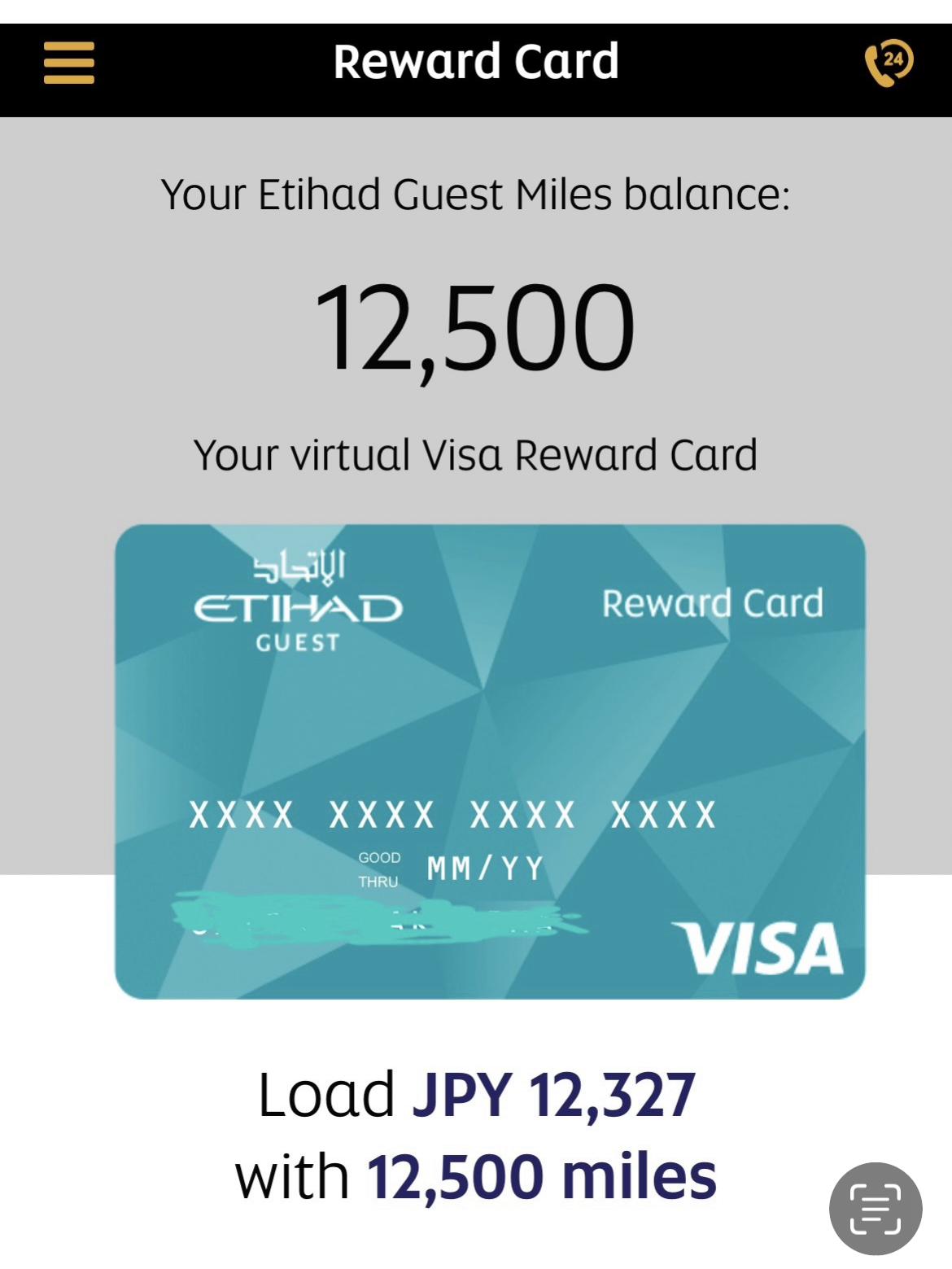 次の手はエティハド航空の「リワードカード」です。マイルをデジタルクレジットカードにチャージしてお買い物に利用できるサービス。