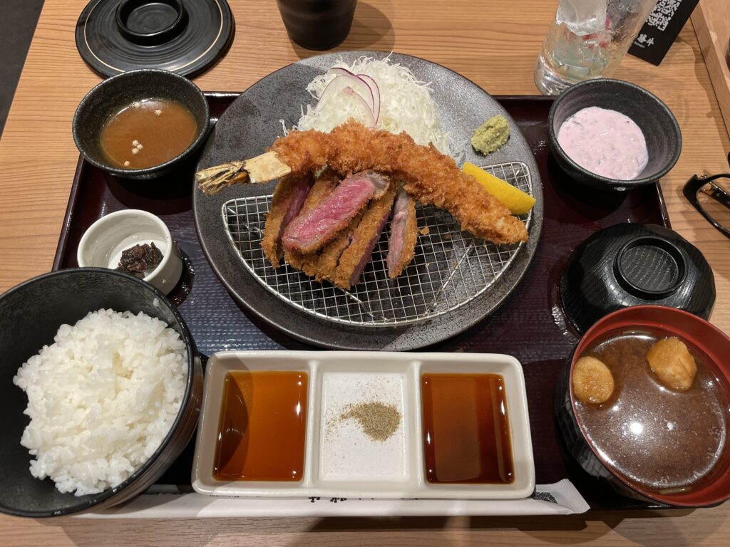 で、20分並んでミャクミャク焼きM1440円買って、京都牛カツ屋に入って夕ご飯。ミャクミャクっぽいソーダ付けて4000円。