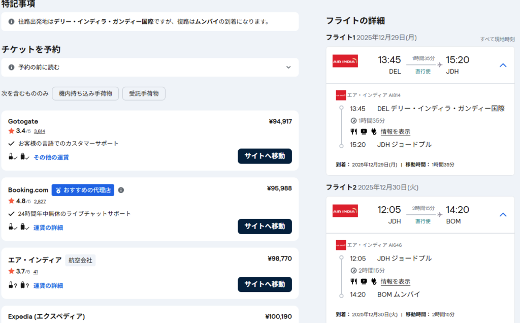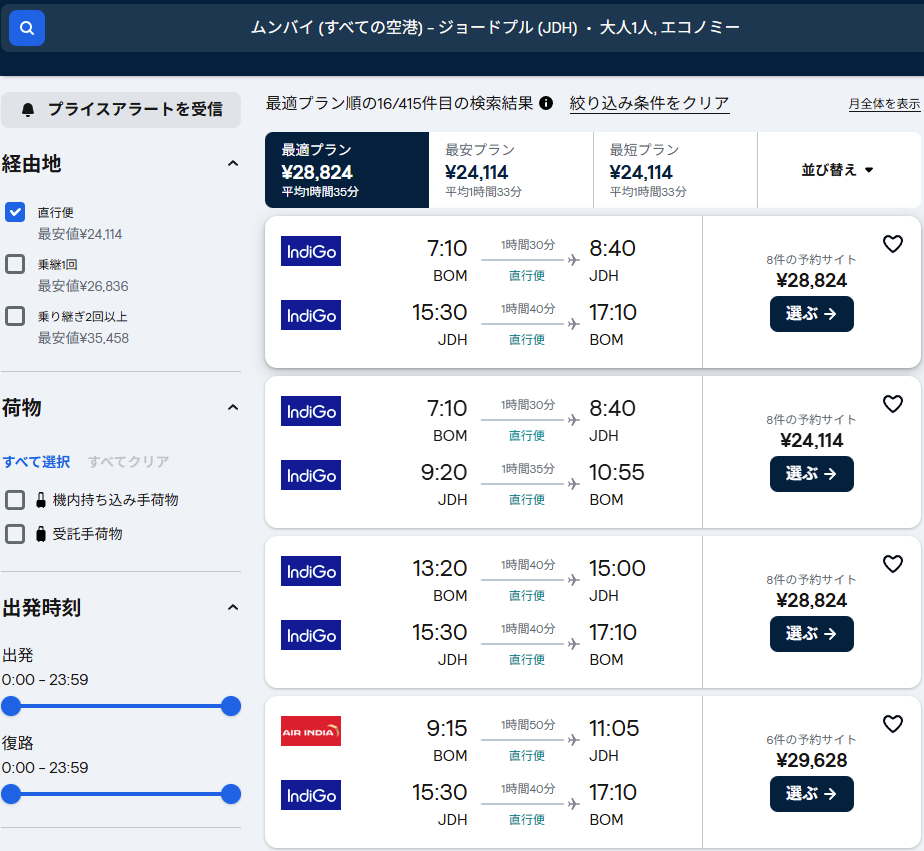 最初は取り直しではなく、ムンバイ発のジョードプル往復のフライトを探したのだが、あるにはあったが時間が合わず。