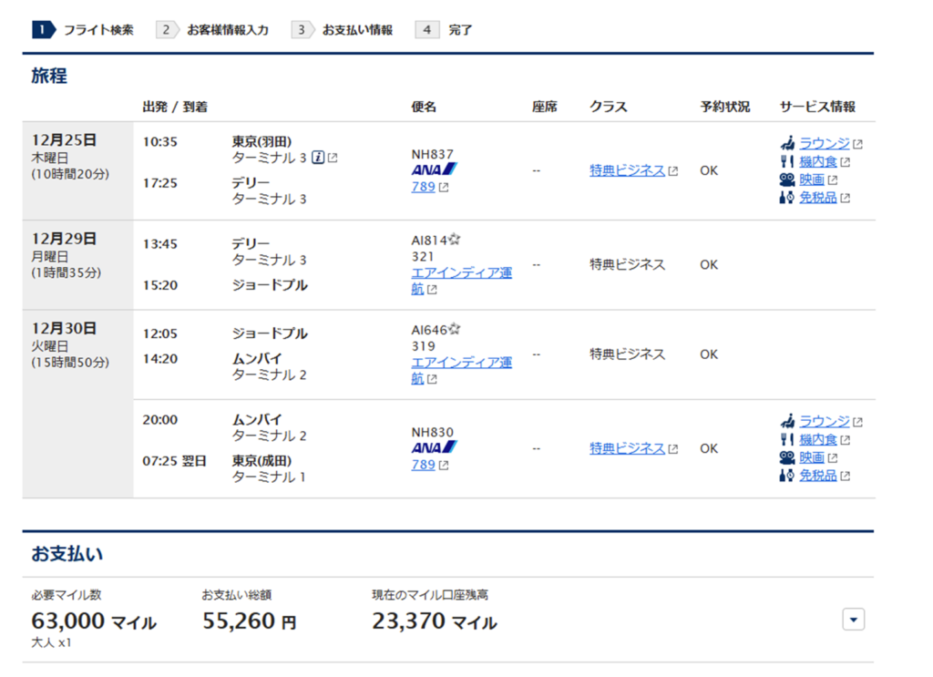 理由としては、興味の持てないムンバイで時間をつぶすよりかは、興味があったジョードプルに行ったほうが面白い旅になると思ったため。それと後からマイルが増えて往復ビジネス取れるマイルになったため。