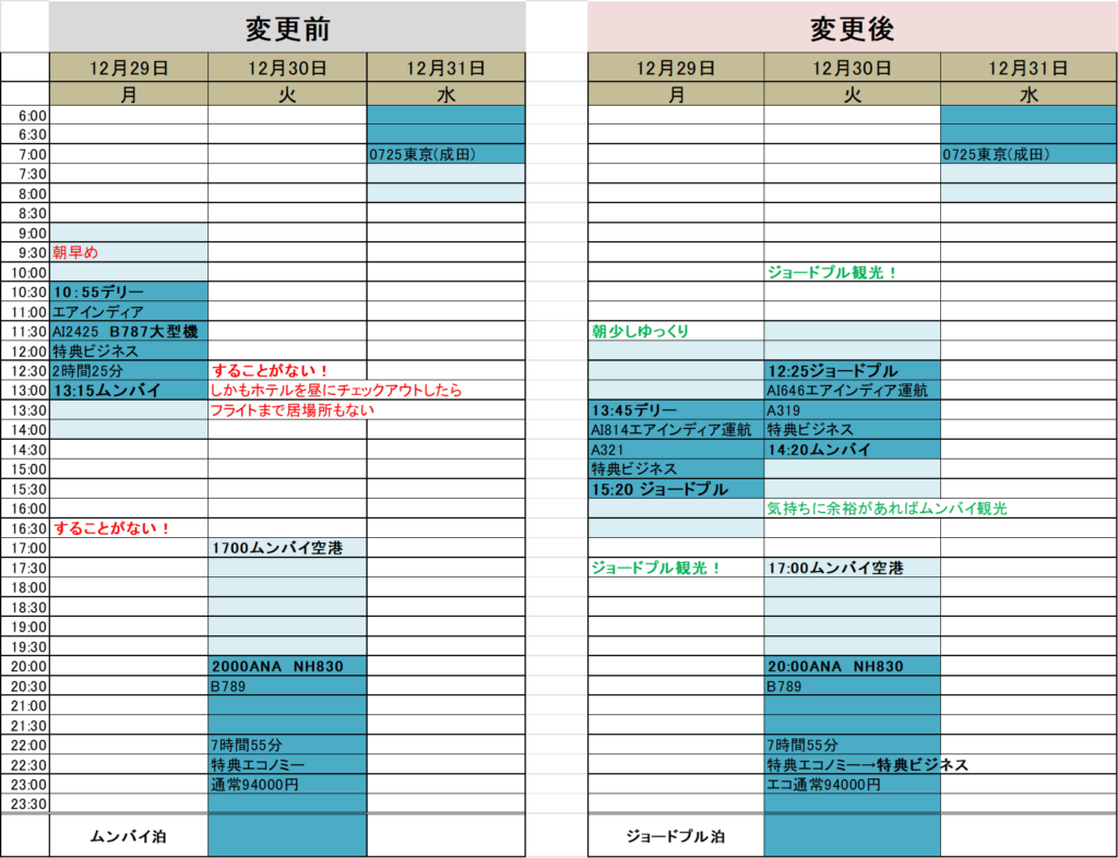 大きく変わったのは、デリーからムンバイへ直行ではなく、間にジョードプルをはさんでいること。そして、往路だけビジネスだったのが、全行程ビジネスに変更。
