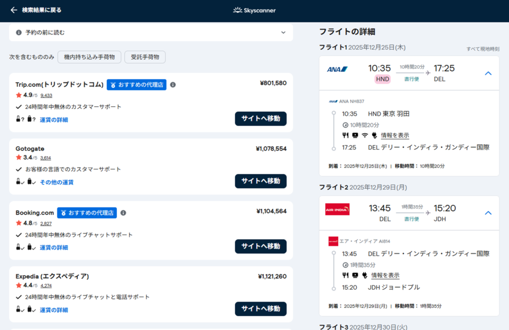 プラス、デリー→ジョードプル、ジョードプル→ムンバイの国内線エアインディアビジネスが約95000~99000円。ANAとの合計で約75万円。