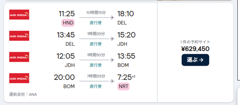 少し先の日程だったとしたら、エアインディア+ANA運航で62万円~。
