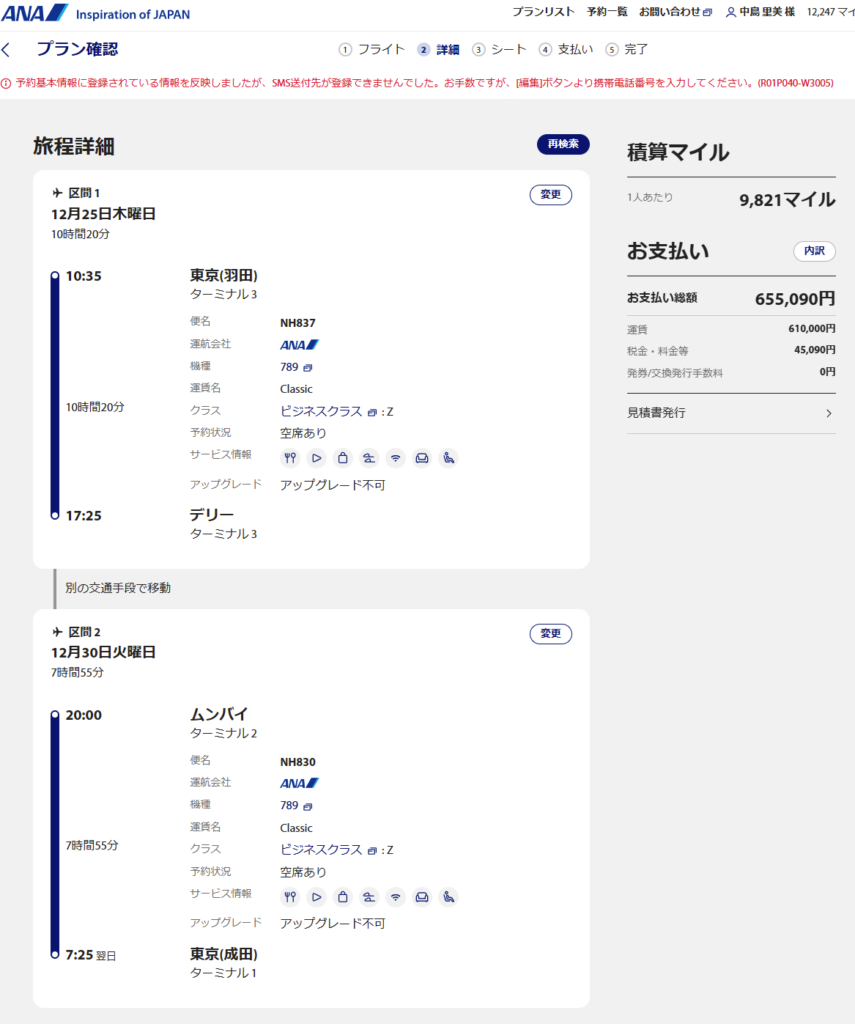 12/30 ムンバイ→東京成田 ANAビジネス
