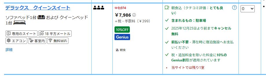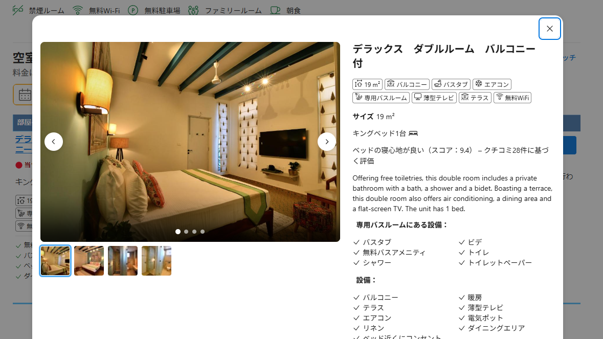 Trip.comではなく、Booking.comでとりました。値段がさして変わらなかったしこちらのほうが確実に「デラックス ダブルルーム バルコニー付」がとれるから。