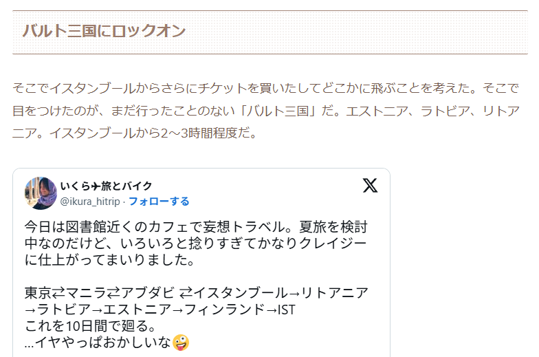 今回、北欧ヘルシンキに行きたいというよりは、ヘルシンキからフェリーで2時間で行ける「エストニア」のタリンが本命です。エストニアを含むラトビア、リトアニアは「バルト三国」と言われており、以前からここに行きたかったのです。2024年の夏旅計画でも登場しています。