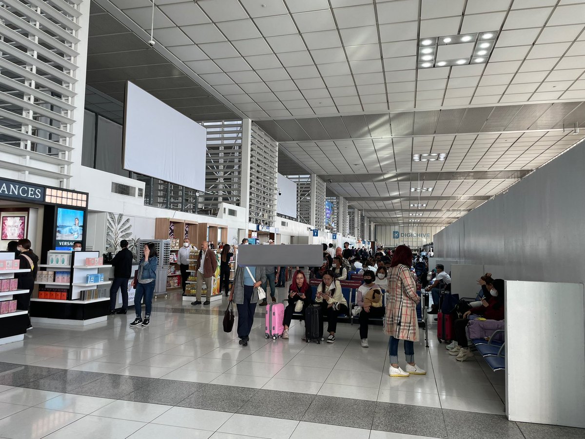 パスポート取り上げられたままなので身動きできず。諦めベンチで横になる人も。同様の別便からの旅客が増えた。