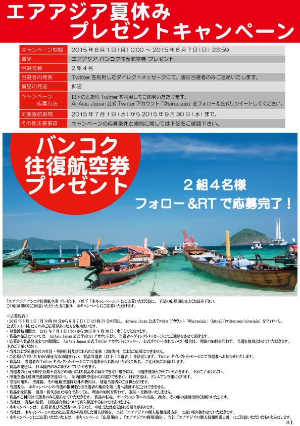 RT @airasiajp: [航空券プレゼントでタイ旅へ!]バンコク直行便を抽選で2組4名様にプレゼント!@airasiajpをフォロー&リツイートで応募完了!出発は7~9月。応募〆切は6/7(日)です。 http://t.co/bfMxdsMonW
