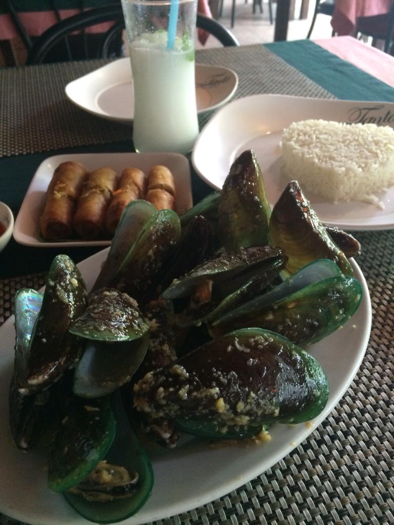 タイグルメレポート7: ムール貝のガーリックバター炒め。山盛りっ激ウマ(≧∇≦)200バーツ。日本でみるムール貝とちょっと色違うね。パール貝かな。ライスはハート形でした。 http://t.co/JX8wCigQHM
