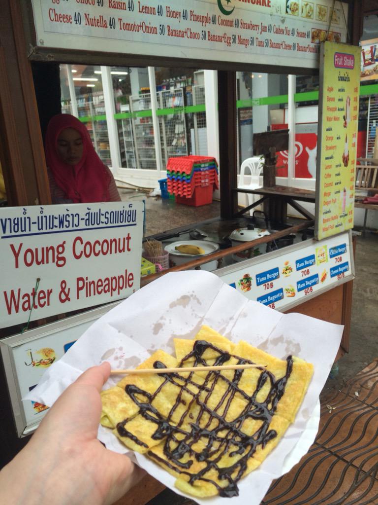 タイグルメレポート7:タイ風屋台パンケーキ。日本でいうクレープでござる。40バーツ。これまたうまい( ´ ▽ ` ) http://t.co/vmv2i0jRqy