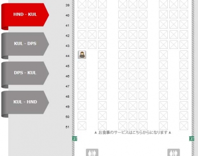 HND→KUL便は、後方の窓際。羽田~クアラルンプール線(エアバス330)は3-3-3列が基本ですが、後方部は2-3-2になります。この壁側2席の窓際がHND→KUL便は1席だけ空いていたのでここに決めました。